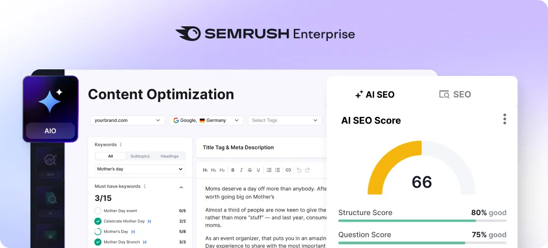 Semrush Enterprise AIO’s new Content Optimization capabilities give you real-time scoring across relevance, cluster coverage, and structure as you write. Then you get guided steps to improve each factor, with live feedback that updates instantly.