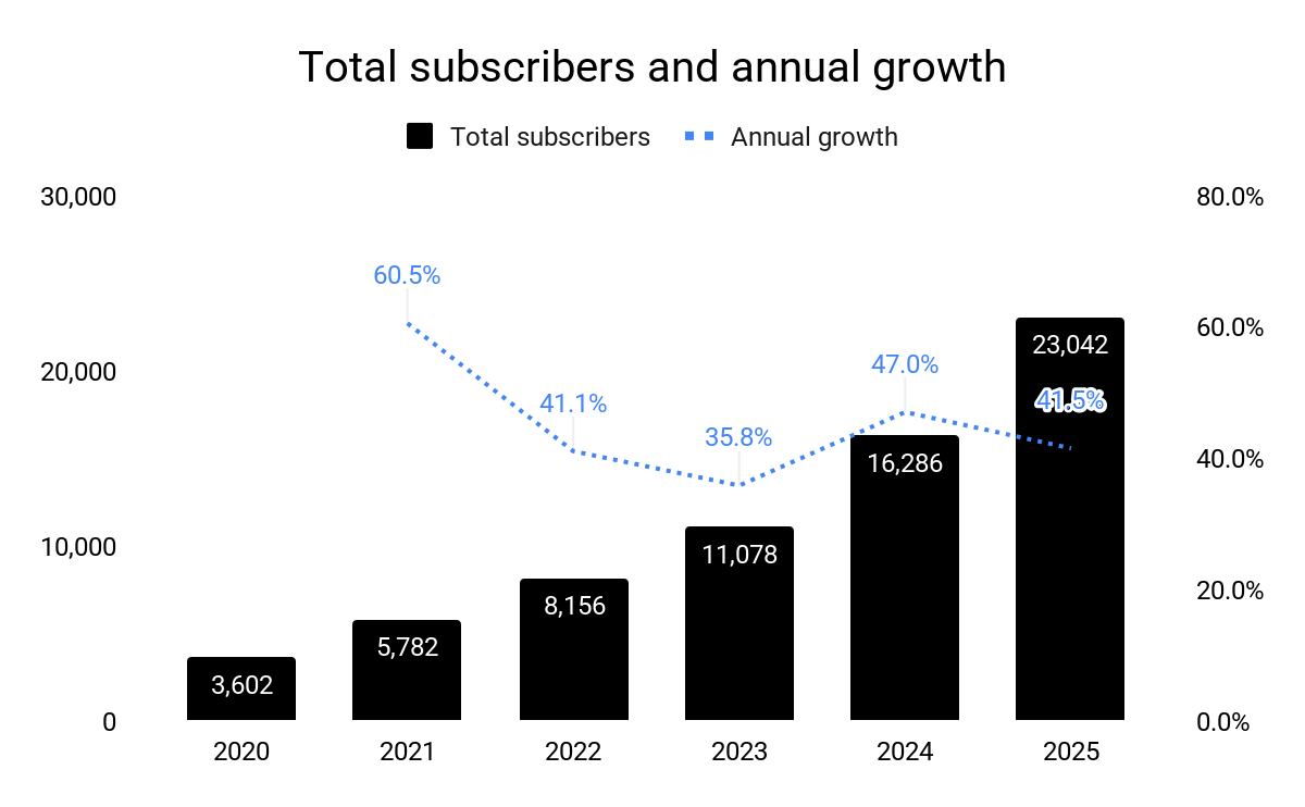 Keeping in mind that 2025 numbers don’t include December, this year will end strong with over 23,000 subscribers.