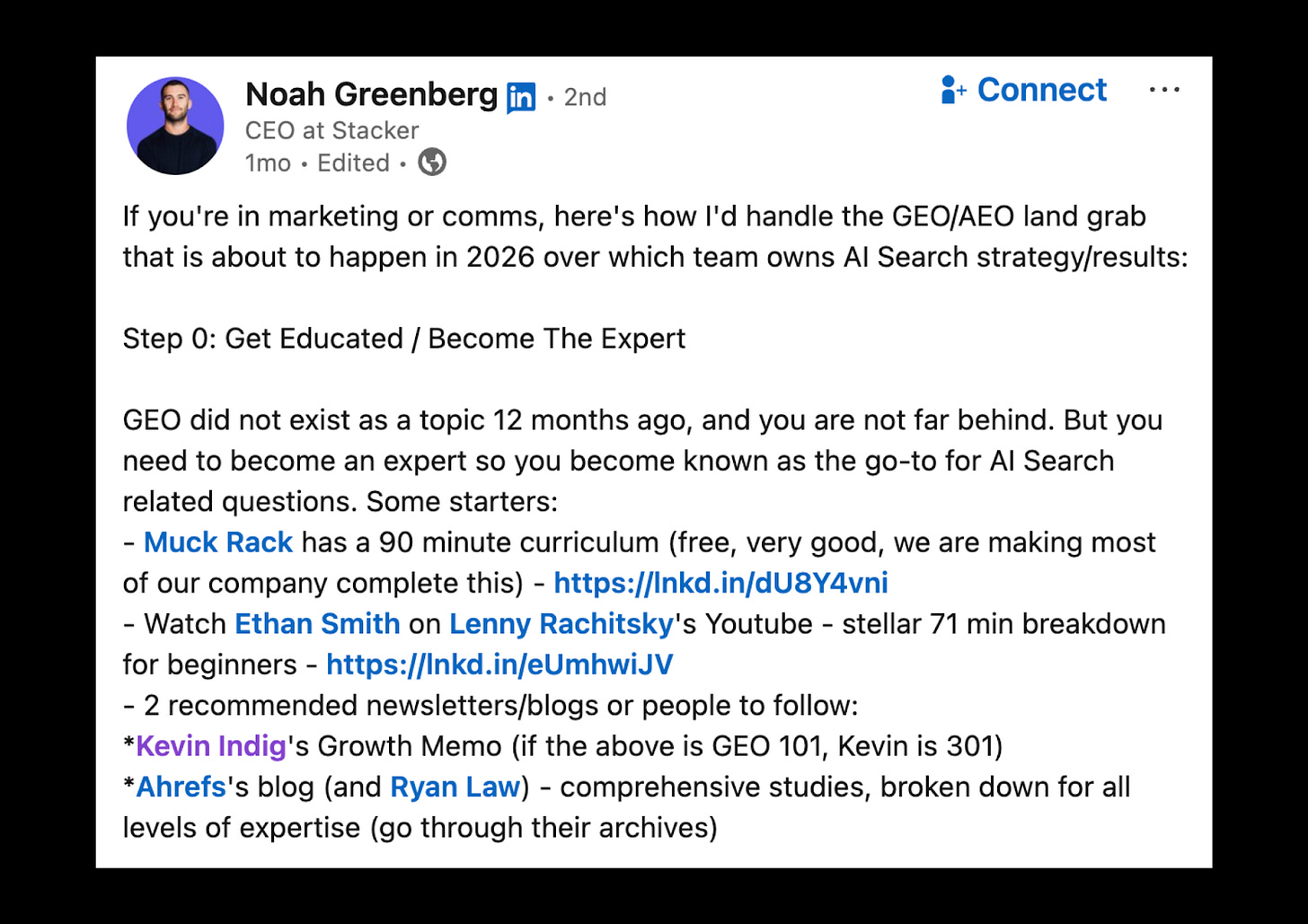 Noah Greenberg outlined this pretty clearly in a recent LinkedIn post - step 0 in your AI SEO transformation is to become the expert.