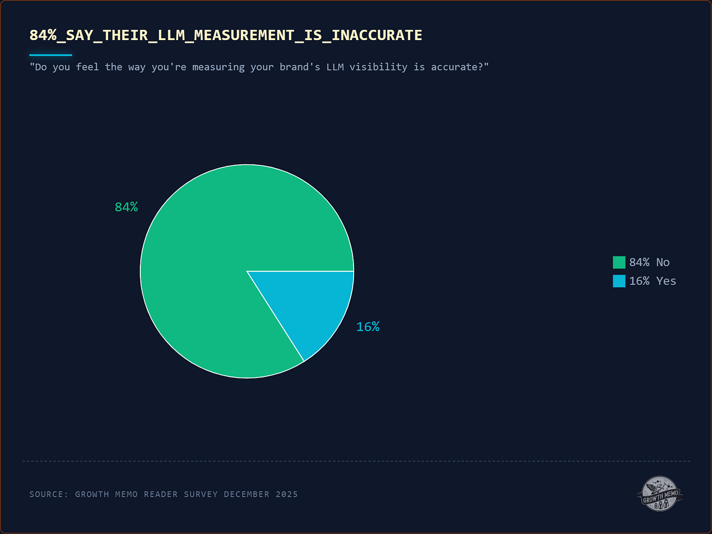 Metrics mismatch with leadership expectations: Executives ask for increased traffic in a growing zero-click environment. Classic SEO reports on influence metrics; leadership sees declining sessions and questions the investment. In our December 2025 Growth Memo reader survey, 84% of respondents said they feel their current LLM visibility measurement approach is inaccurate. Teams can’t prove value because no one has agreed on how value would be proven.