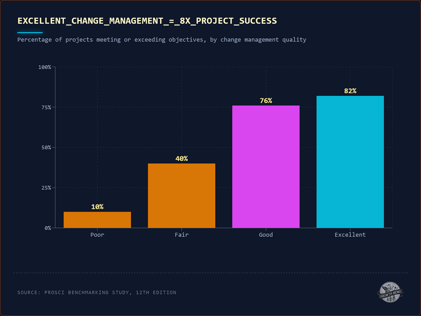 The most powerful evidence for intentional change management for any initiatives - SEO, AI, or otherwise - comes from Prosci’s 12th Edition benchmarking study. (Prosci’s study is the largest body of change management research, covering 2K+ practitioners, 400K+ data cells, over 25 years of accumulated findings.)