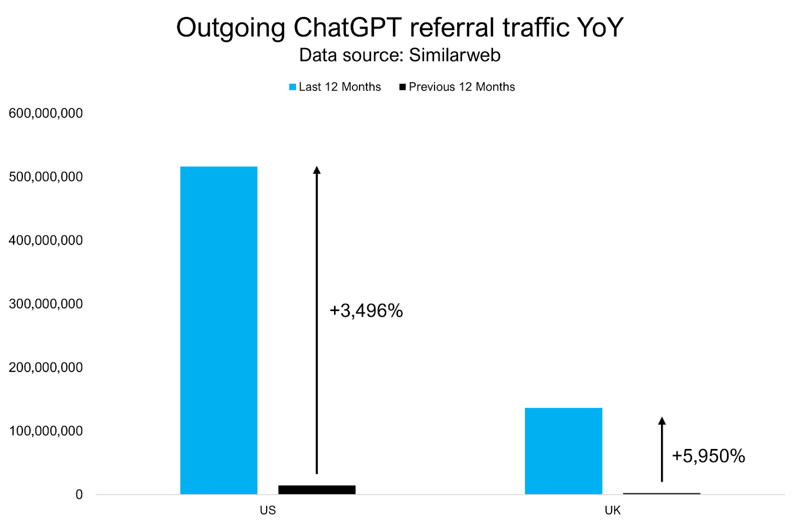 Over the last 12 months, ChatGPT’s US referral traffic to websites jumped by +3,496% (UK: +5,950%), from 14 to 516 million (after cleaning up referrals to Openai.com, which are mostly authentications).
