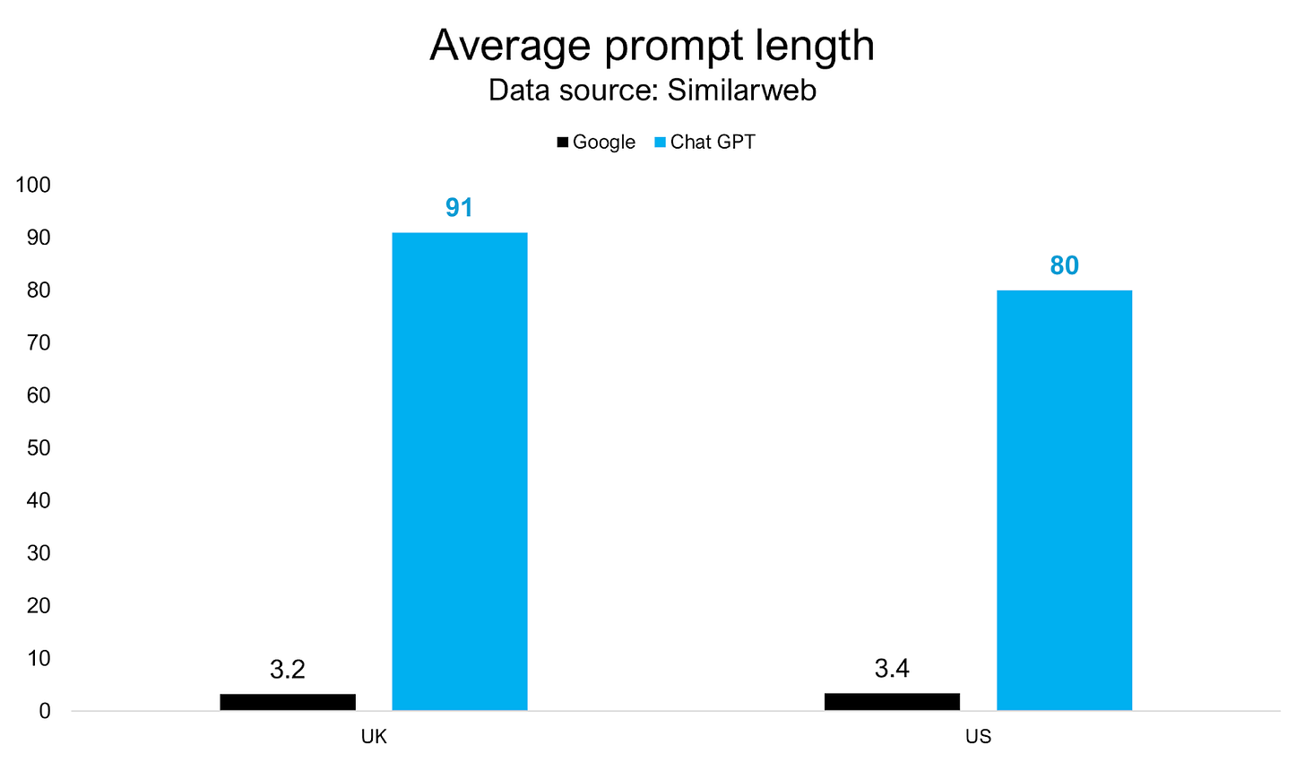 Even informational prompts are 10x longer (~38 words) on ChatGPT than on Google. People ask more detailed questions, which reveal much more about themselves and their intent.
