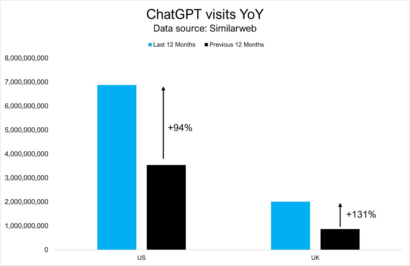 Over the last 12 months in the US, ChatGPT visits grew from 3.5 to 6.8 billion visits (+94%).