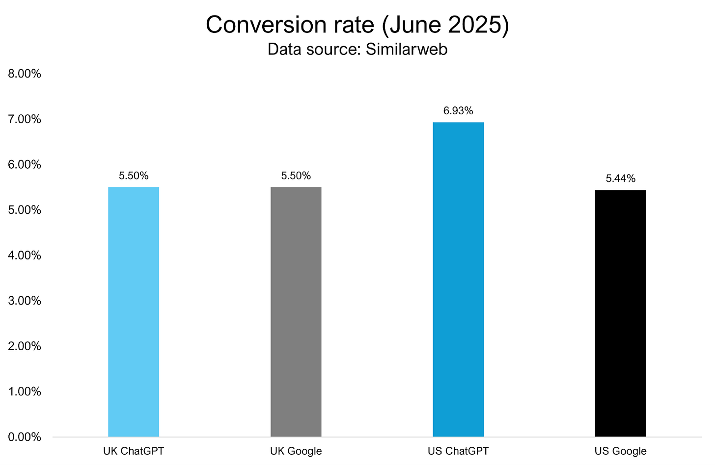 ChatGPT’s conversion rate of transactional traffic was 6.9% in the US compared to 5.4% for Google.