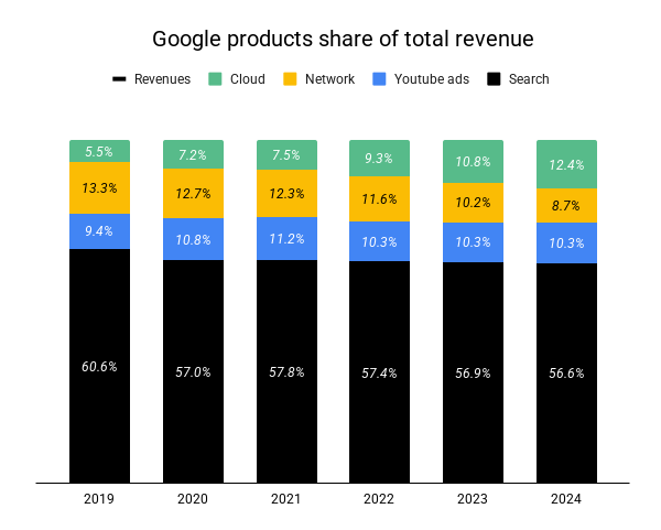 Google is doing well: Search revenue has grown to almost $200 billion in 2024, up from $175 billion the year before. Search ads still make up over 50% of Alphabet’s revenue, Youtube is stable and Cloud offsets the dropping Network revenue.