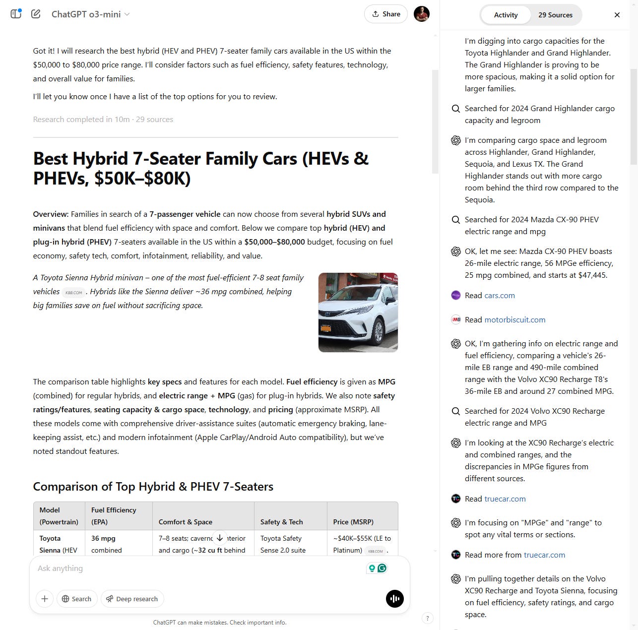 Deep Search performs tens to hundreds of searches to compile a report. I’ve tried prompts for purchase decisions. When I asked for “the best hybrid family car with 7 seats in the price range of $50,000 to $80,000”, Deep Research browsed through 41 search results and reasoned its way through the content.
