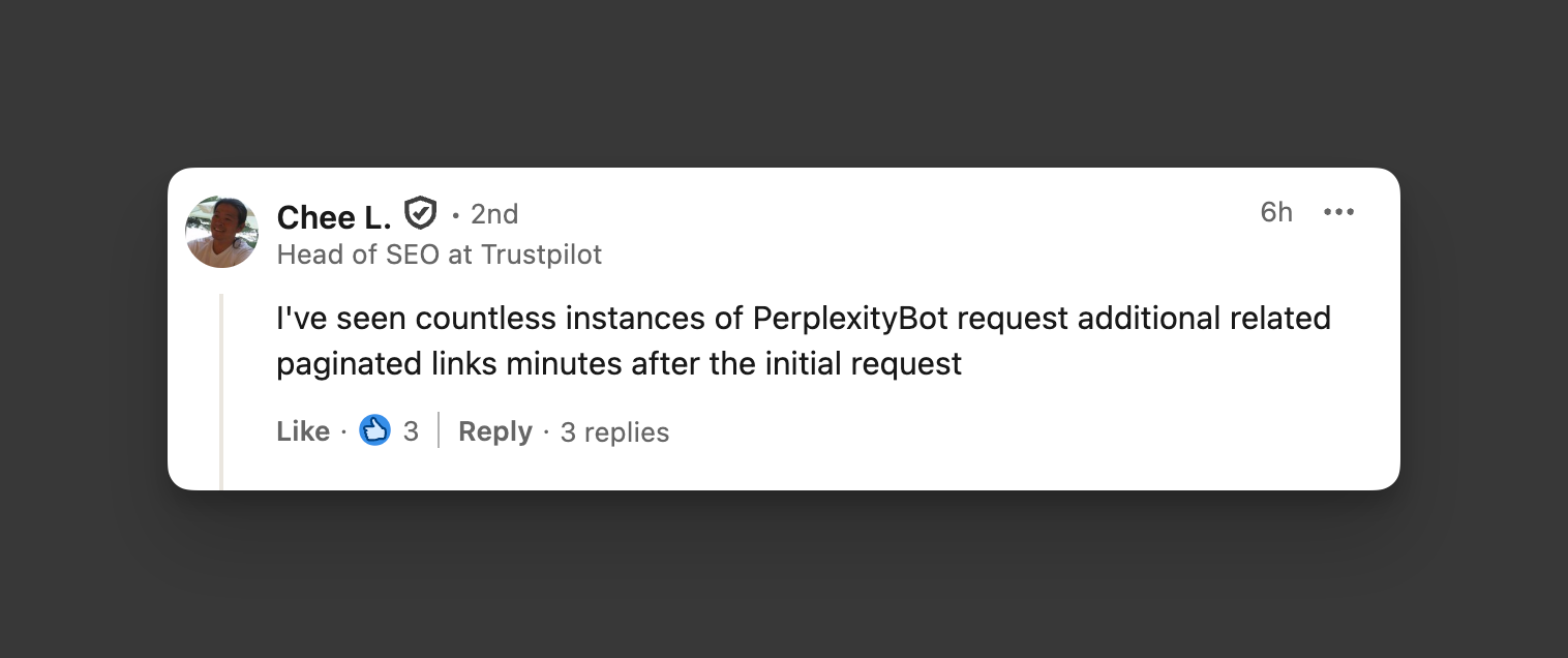 Chee Lo, Head of SEO at Trustpilot, shared his experience with Perplexity, which seems to be a bit more aggressive than other bots.