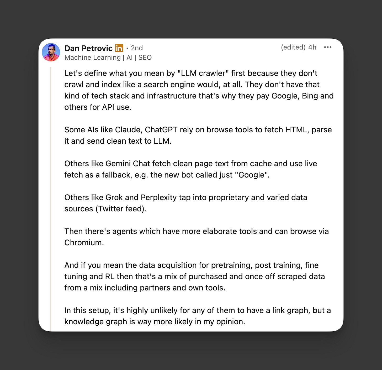 Dan Petrovic, Founder and CEO of Dejan SEO, gave a detailed answer about the differences between a) the types of LLM crawlers and b) the different LLMs and how they behave.