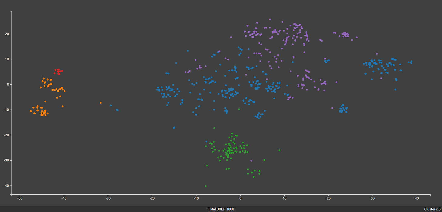 It shows 2 clusters with nodes very close together (red and orange) and 3 other clusters that are spread apart (green, blue and purple). Guess which clusters outperform the others in organic search? Red and orange!