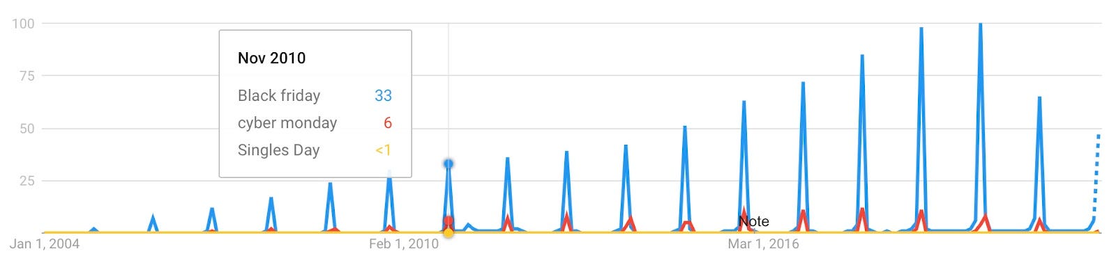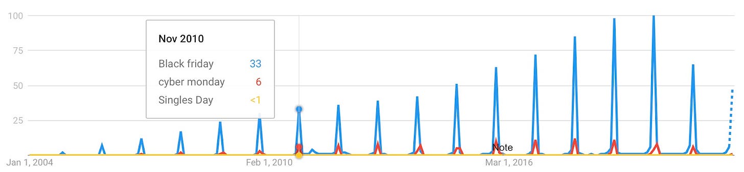 That’s why it’s even more surprising to see that the demand for the search term “black friday” in 2020 was way lower than in 2019, and 2021 is projected to be even lower than that.