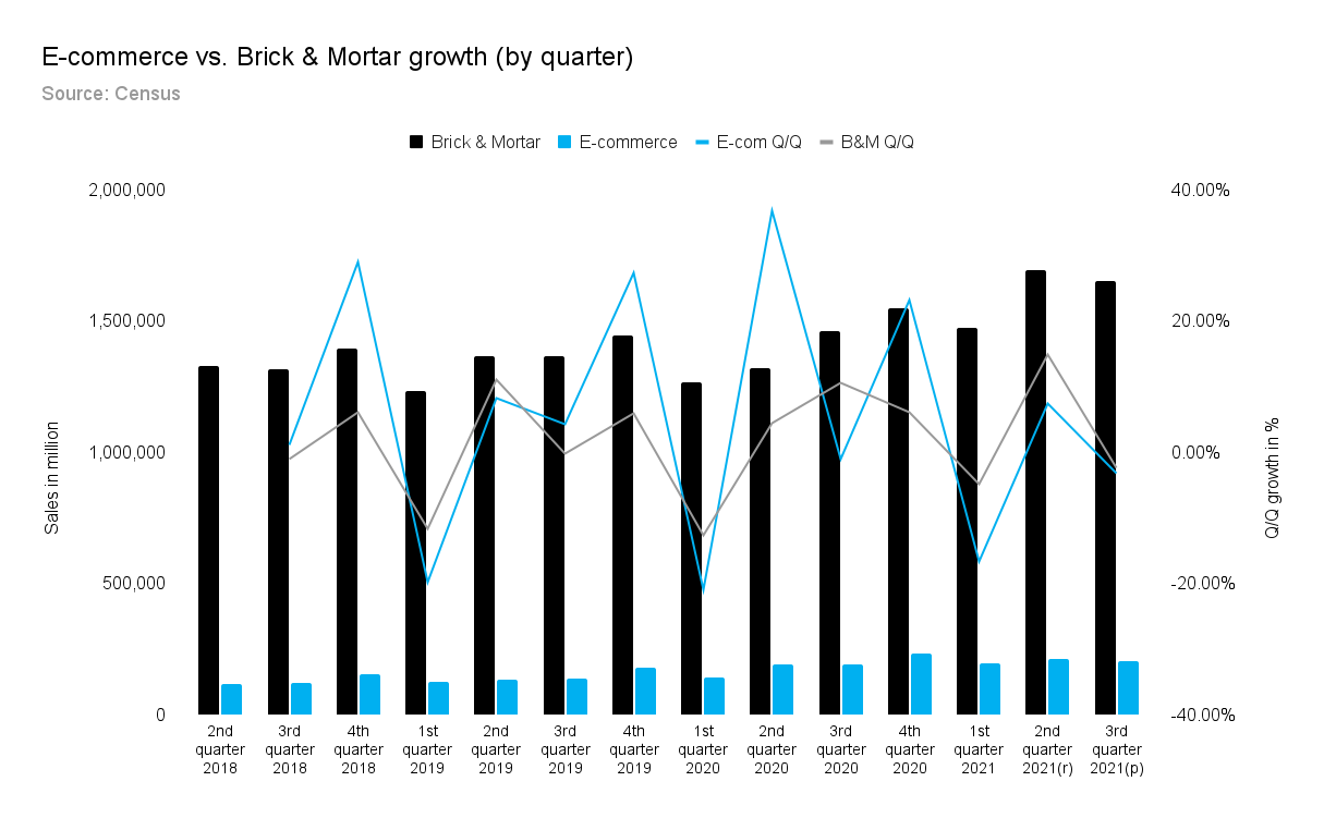 Based on Census data, e-commerce generates only 12% of the sales of Brick & Mortar. We often forget how powerful Brick & Mortar still is, even though e-commerce grows at a much faster rate. [link]