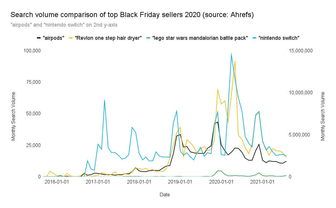 Is Black Friday/Cyber Monday the SEO highlight of the year for e-commerce? I looked up the search volume of the four top sellers in 2020 to find out.