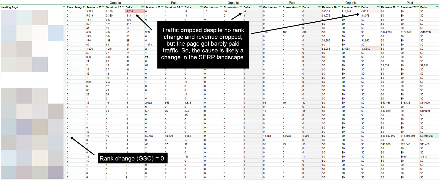 In the last step, sort the sheet by negative organic revenue or conversions and look at the columns for rank and traffic to define your hypothesis.