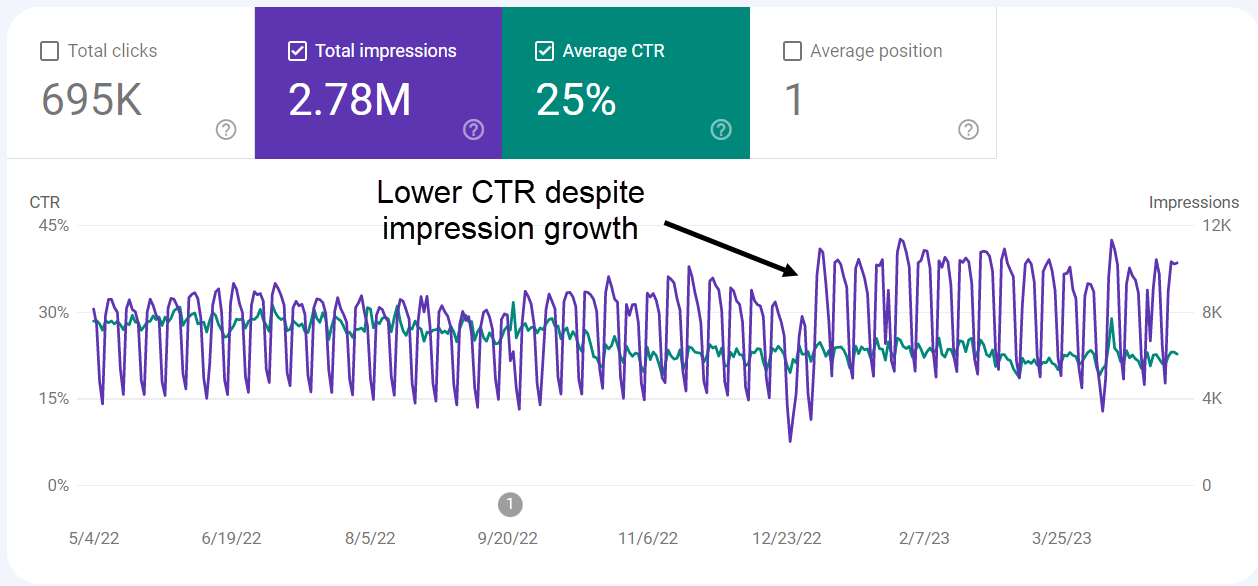 The same view with impressions instead of rank (since we know it's flat) shows how impressions grow, but CTR remains unchanged. More people see the result but don't click because something else seems to deliver a better result.