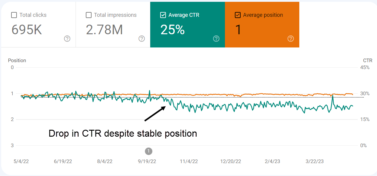 The example in the screenshot below shows how organic rank is stable throughout the last 12 months, but CTR dropped.