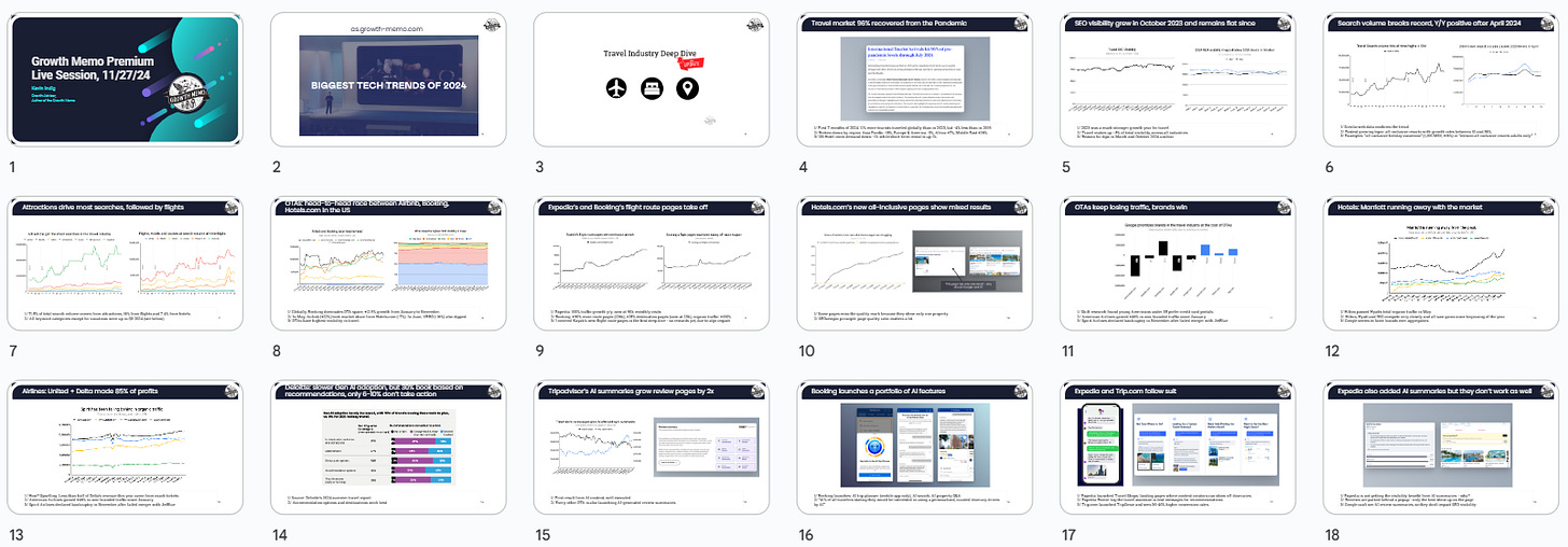 Playback speed×Share postShare post at current timeShare from 0:000:00/0:00Paid episodeThe full episode is only available to paid subscribers of Growth MemoSubscribe to watchLive Session recap - 11/27/24Video recording, slides and show notesDec 20, 2024∙ Paid2ShareThank you all for joining! As always, I’m sharing the slide deck, a summary and all links to essential articles from the Live Session with you.Get the slidesYou can find a more in-depth write-up of the travel deep…This post is for paid subscribersSubscribeAlready a paid subscriber? Sign inGrowth MemoSubscribeRecent PostsLive Session recap - 1/31/25Feb 13How to accelerate your SEO careerJan 20 • Kevin IndigE-commerce Deep Dive, Q1 2025Jan 20Why I recommend my clients to expand from SEO to YoutubeJan 13 • Kevin Indig2025 predictions and 2024 reviewJan 6 • Kevin IndigAnnual Showdown 2024Dec 17, 2024 • Kevin IndigLive Session recap - 11/13/24Nov 15, 2024 • Kevin Indig