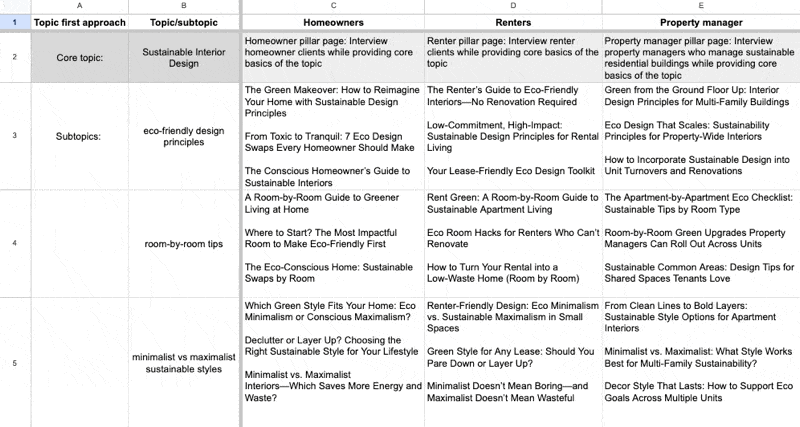 Instead of living in keyword lists, you’ll live in a topic map - prioritizing meeting the needs of separate personas or ICPs in your target audience, and later pairing search queries that best help the people you serve find you.