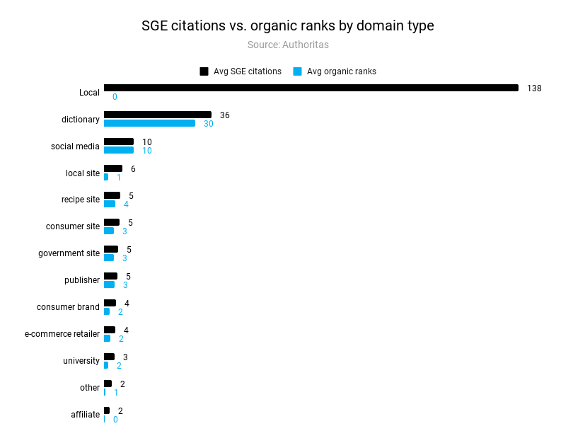 Another interesting pattern is which site types make up most SGE citations from the 1,000 keywords Authoritas analyzed: we find local and dictionary sites at the top with a big gap to other types.