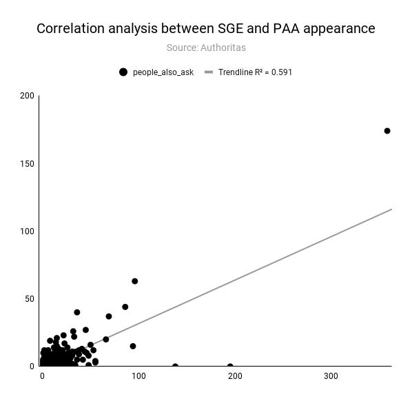 I found an interesting relationship between citations in SGE and PAA (People Also Ask) SERP Features in the Authoritas data. With a coefficient of .77, the correlation is very strong.