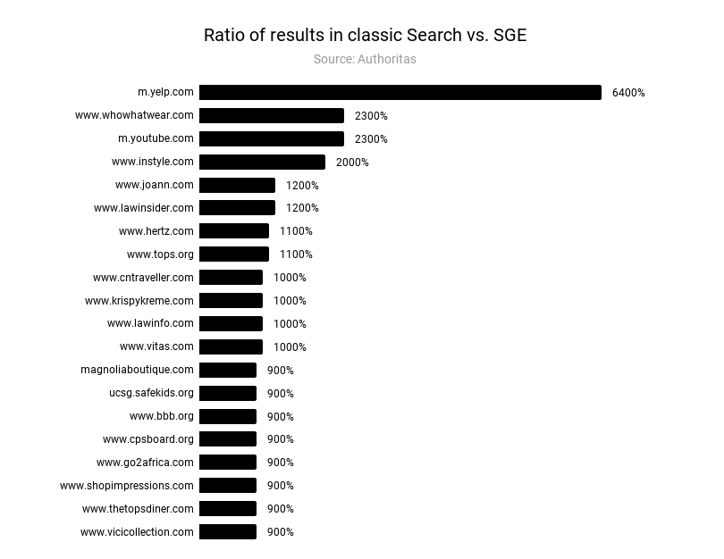 Those domains would get more visibility if SGE rolled out today. However, keep in mind that the Authoritas study is based on a small sample of short-head keywords, and we don’t know how many users would click on citations in different types of SGE modules.