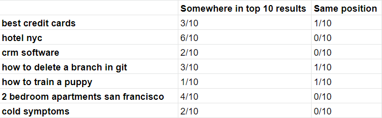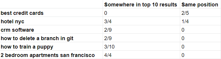 Compare the search results between Google and Bing. Most people would probably place Bing as closer to Google than Yandex. And yet, the overlap is equally small (see table below).