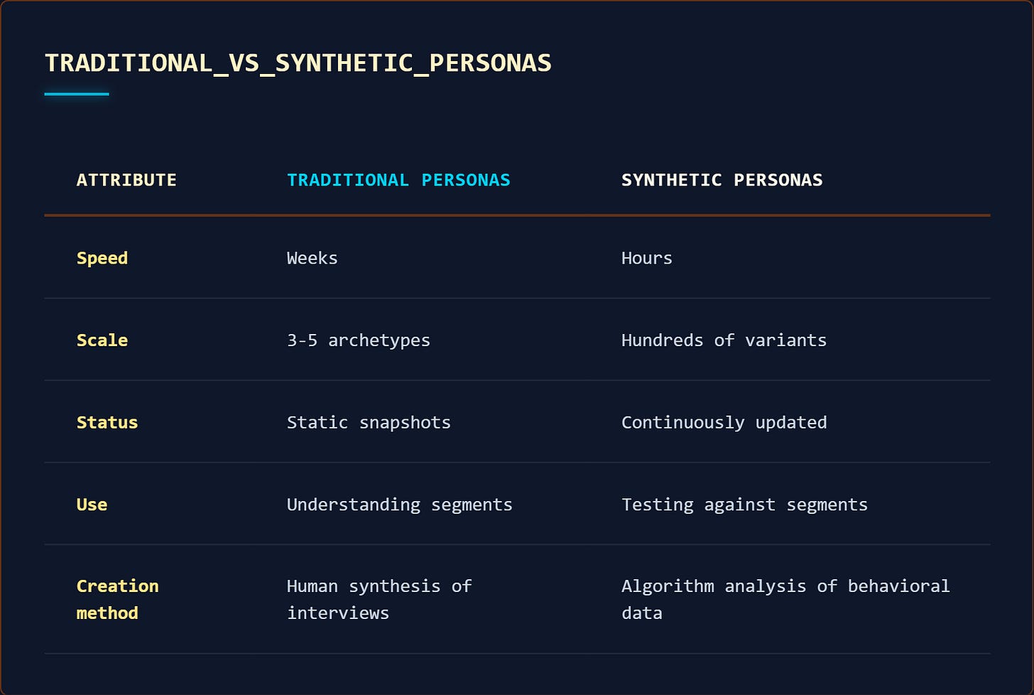 The shift: Traditional personas are descriptive (who the user is), synthetic personas are predictive (how the user behaves). One documents a segment, the other simulates it.