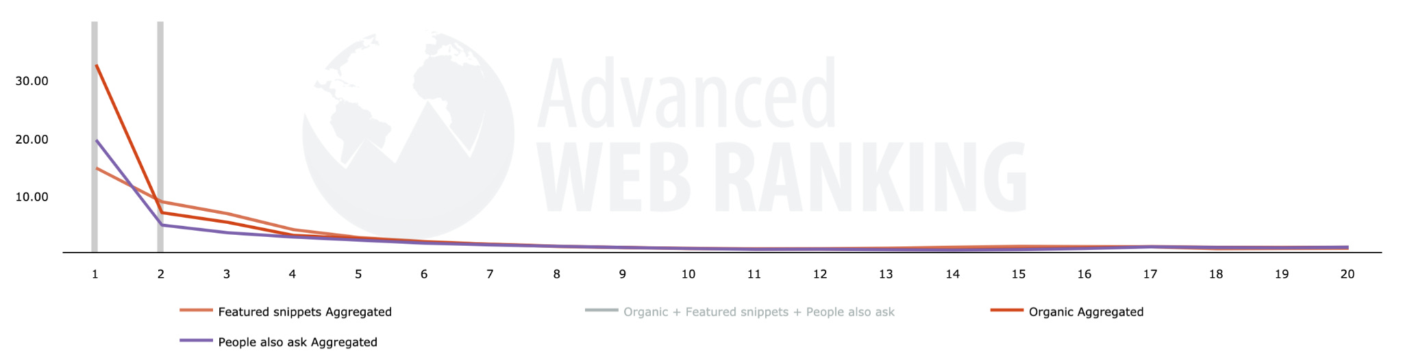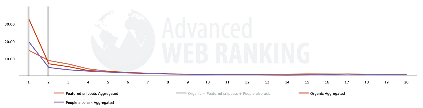 First, click curves vary by SERP Features. In the screenshot below, you see a comparison of click curves when a featured snippet, people also asked, or no SERP features are present in mobile search results. They vary widely!