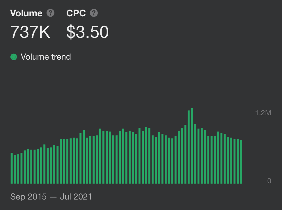 It’s also important to show how the market is growing over time. One way to do this is to use the Keywords Everywhere browser plugin because it provides search volume since 2004. You might not need to go so far back; even the last five years are very useful. Just make sure you have enough data to put noise through Covid into perspective.