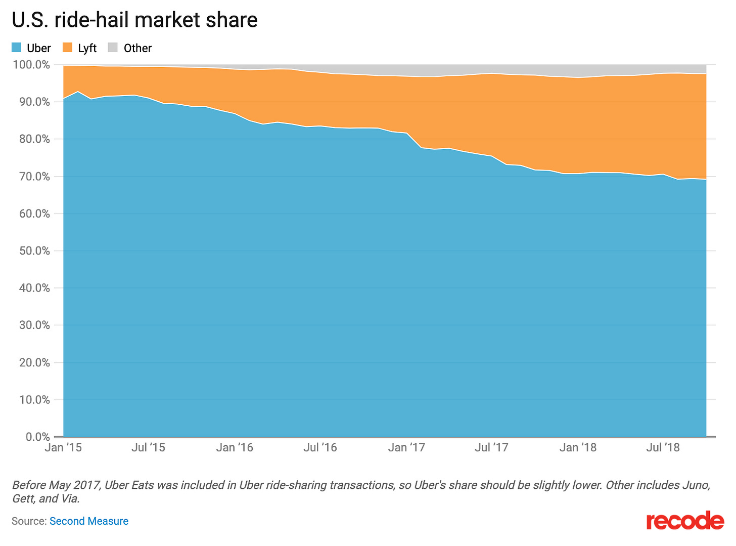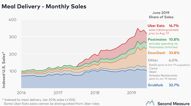 In late 2014, UBER broke into a new category, food delivery, with UBER Eats. It started gaining market share in mid 2017 and growing with the market.