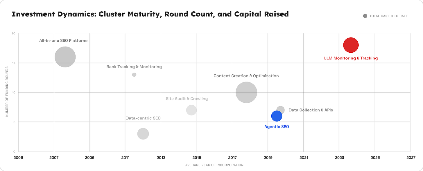 73% of AI Visibility tracking companies were founded in 2024 and raised $12 million on average. That check size is typically reserved for scale-stage companies with proven market-fit.
