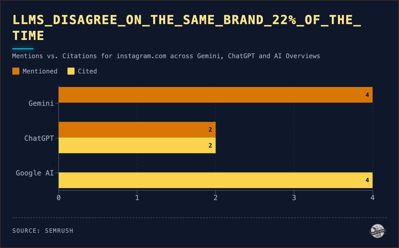 Instagram.com was mentioned by ChatGPT and Gemini but only cited (not named) by Google.