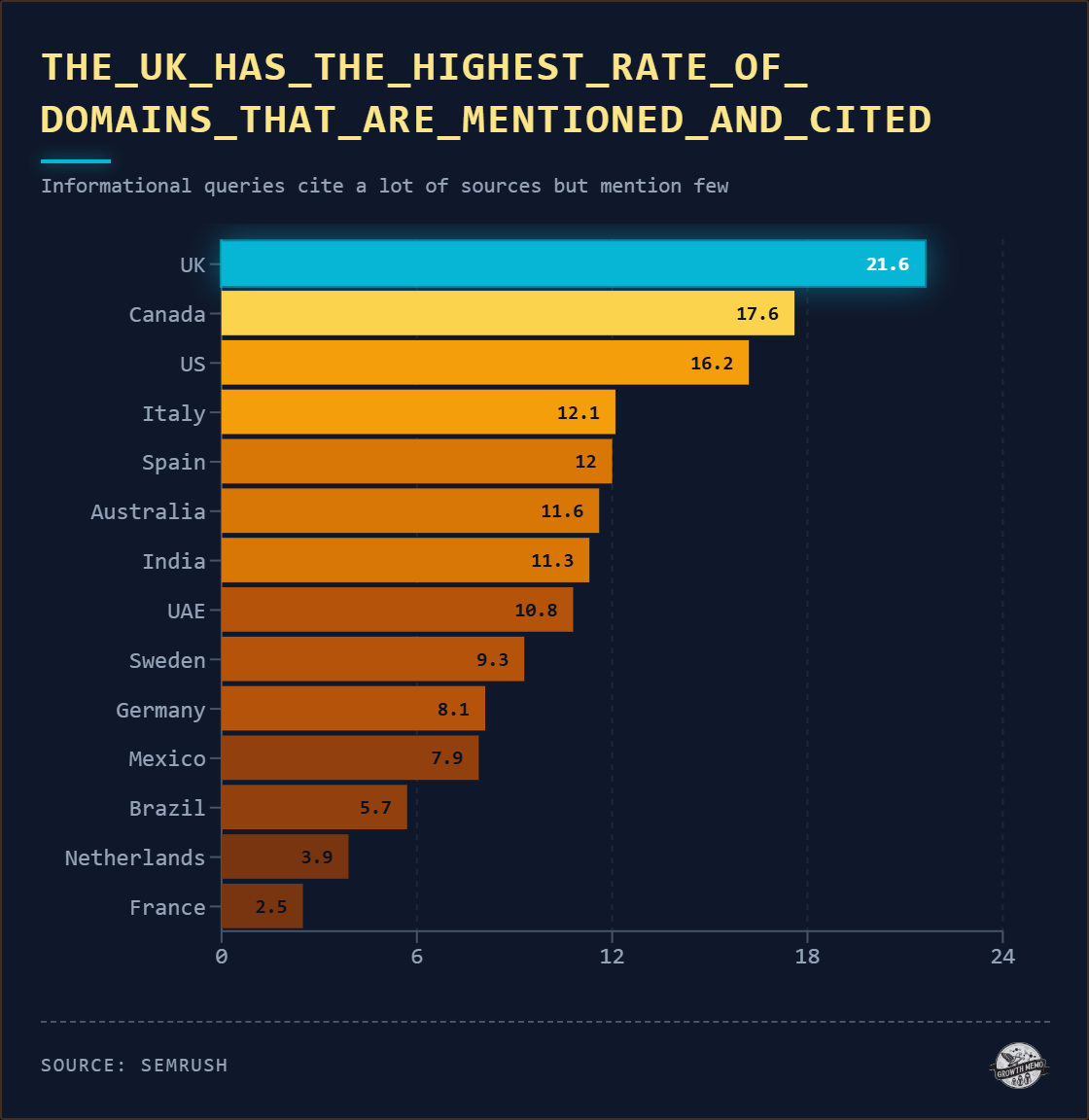 India and Sweden show the highest mention rates (50%), suggesting more conversational or brand-forward query patterns in those markets.