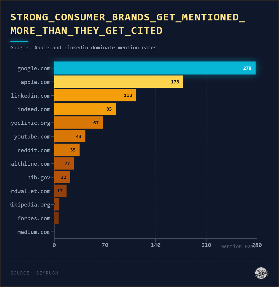 A clear pattern emerges among domains appearing 3 or more times: Content aggregators and academic sources are cited repeatedly but almost never mentioned.