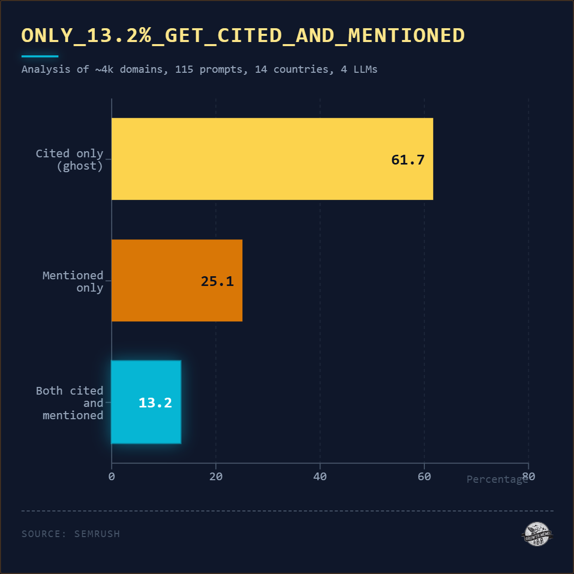 Only 13.2% of appearances convert into both a citation and a mention. Not a single domain was cited, but not mentioned at all or vice versa.