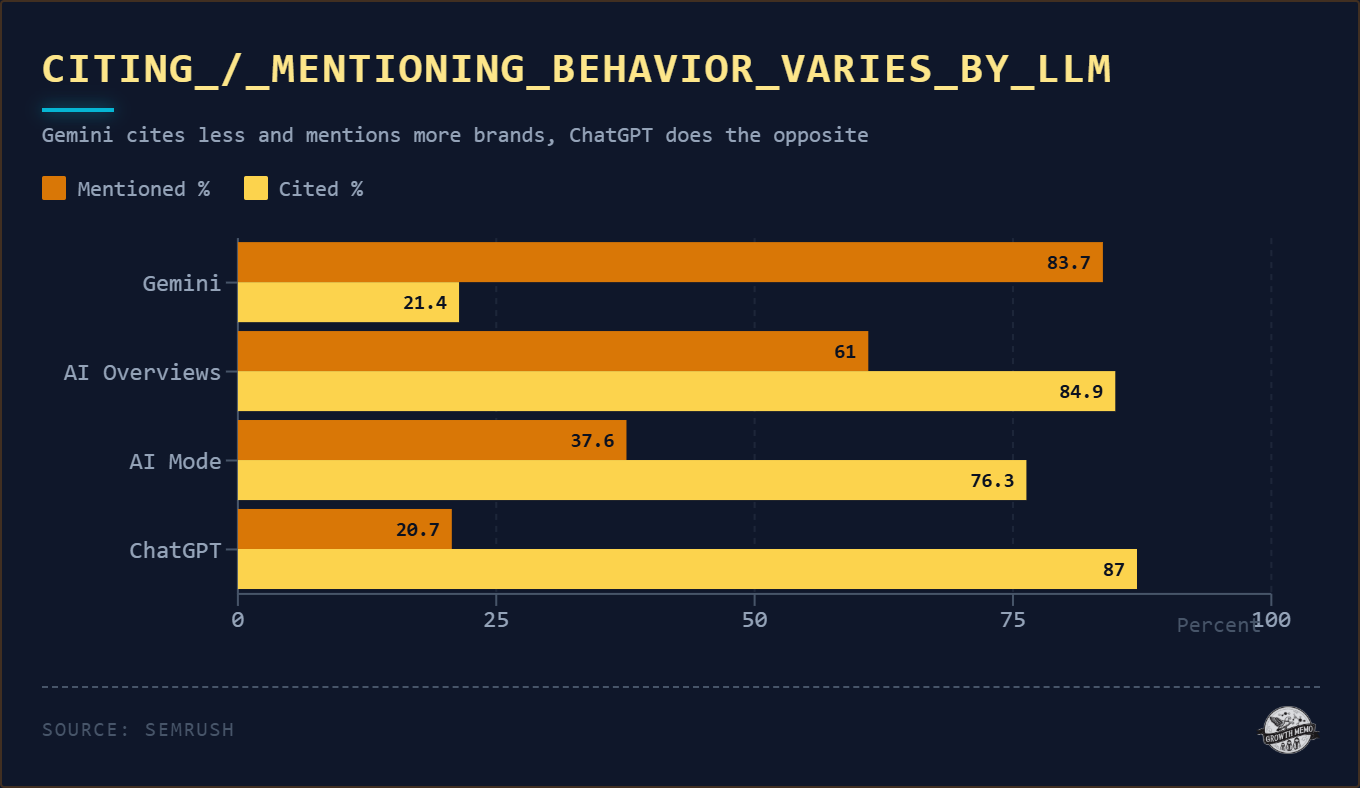 ChatGPT is the opposite: It cites 87.0% of the time but mentions brands in only 20.7% of answers, functioning more like an academic paper with footnotes.