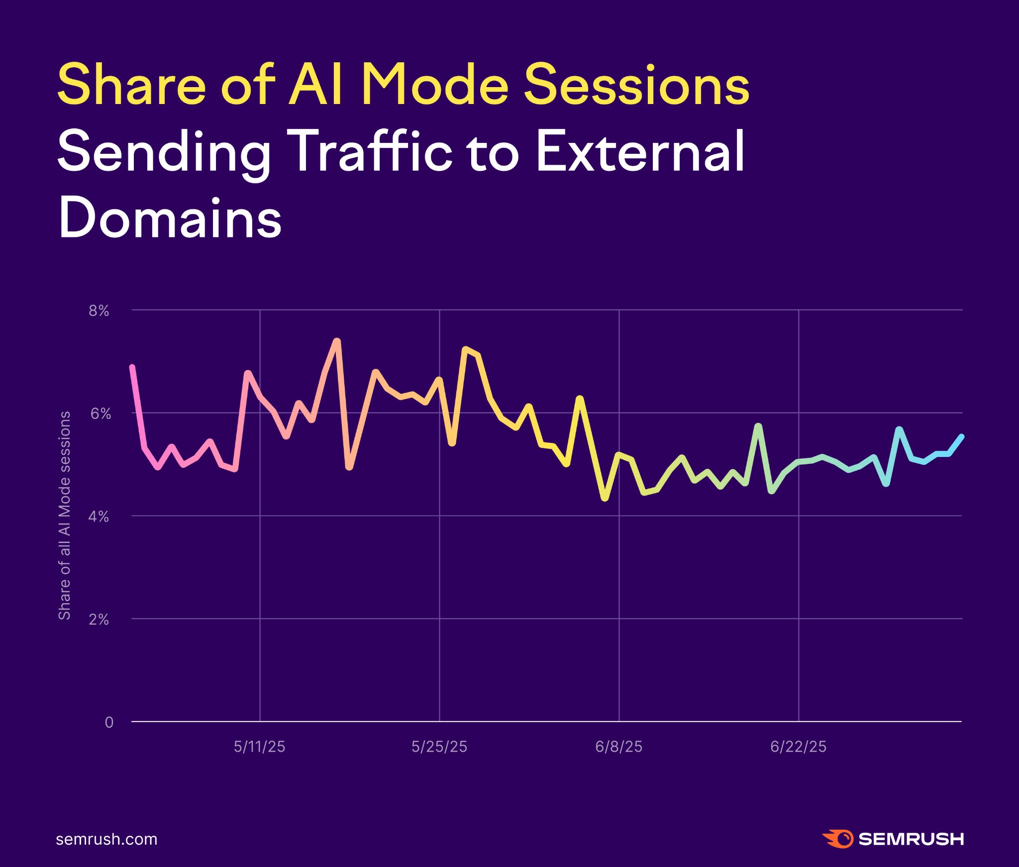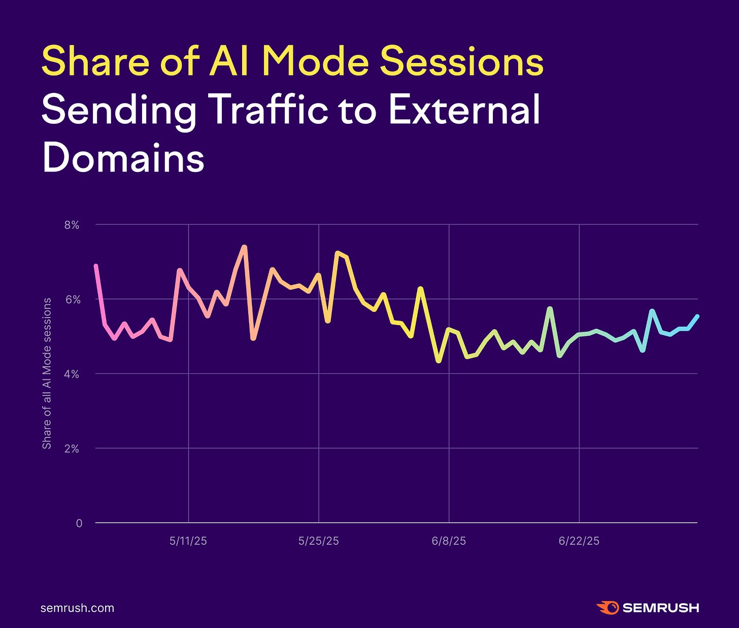 Semrush’s AI Mode early‑adoption analysis of ~69 million U.S. Google sessions found that 92 - 94% of AI Mode sessions resulted in no external click, and only 6-8% produced any outbound traffic [1].
