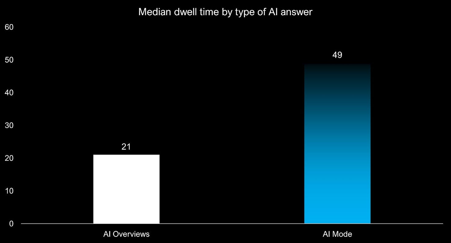 While we found in our research that AI Overviews act more like fact sheets, where users skim to find quick information, AI Mode gets deeper engagement. Users spend on average twice as much time with AI Mode as with AI Overviews.