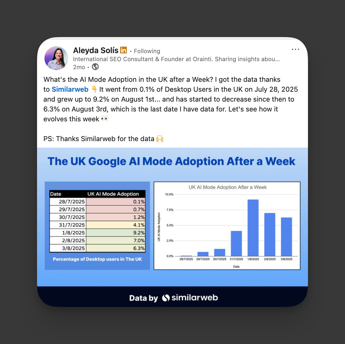 In addition, back in August, Aleyda Solis shared UK adoption of AI Mode slowed after user curiosity seemed to subside after the initial launch.