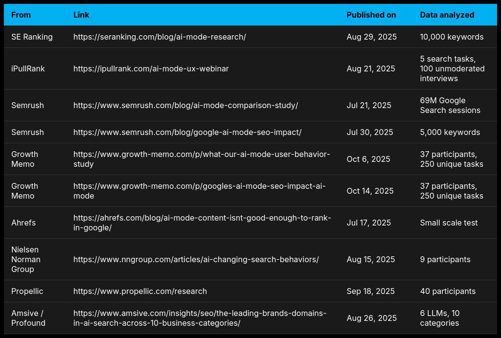 We looked for commonalities and differences across 10 AI Mode studies - here's what we found