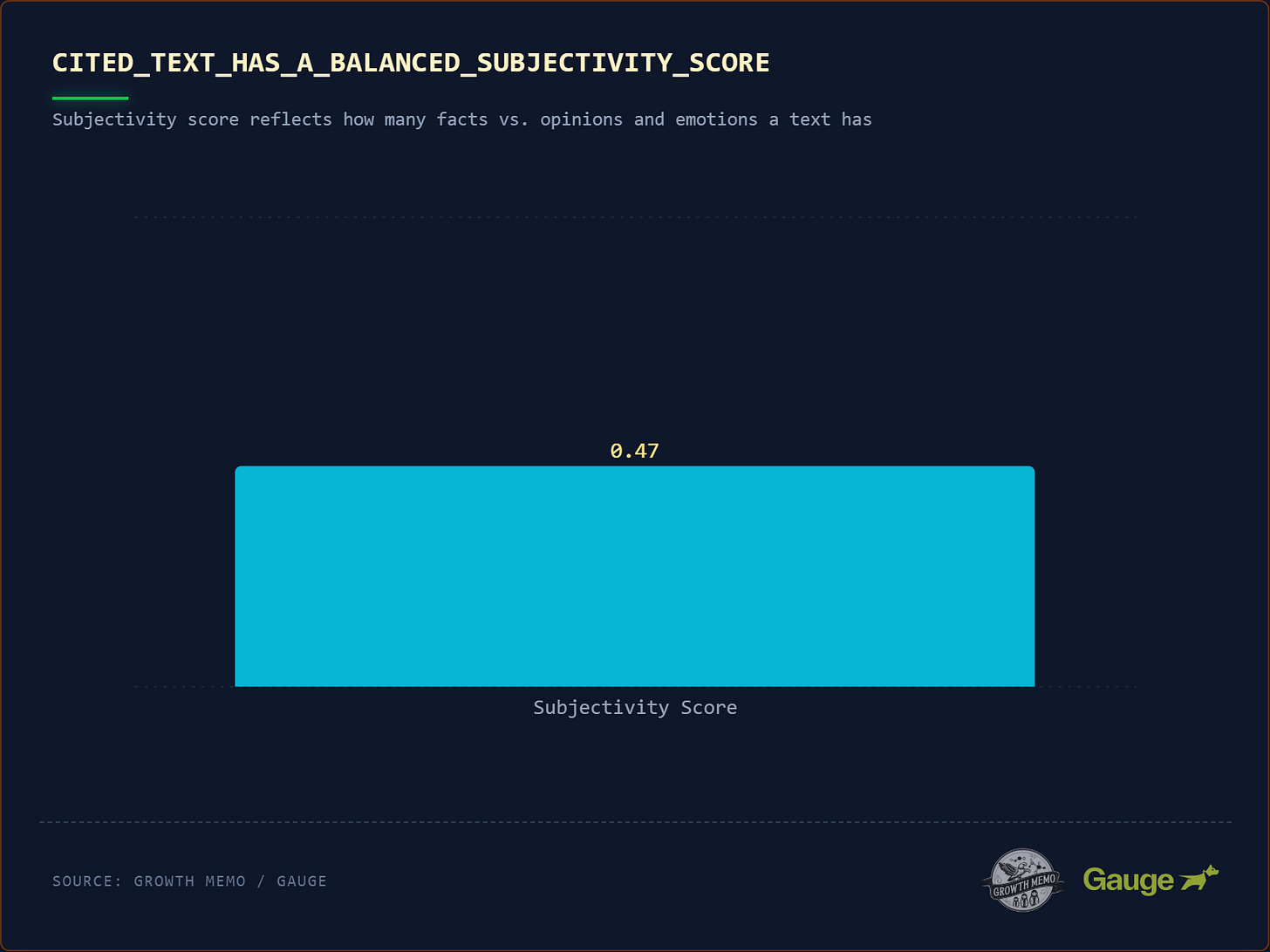 Citation winners are almost 2x more likely (36.2% vs 20.2%) to contain definitive language (“is defined as,” “refers to”). The language citation doesn’t have to be a definition verbatim, but the relationships between concepts have to be clear.