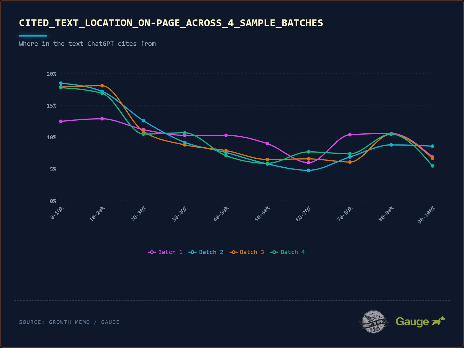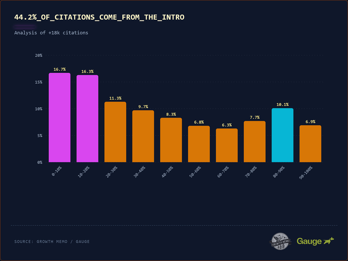 24.7% of citations come from the last third of an article (the conclusion). It proves the AI does wake up at the end (much like humans). It skips the actual footer (see the 90-100% drop-off), but it loves the “Summary” or “Conclusion” section right before the footer.