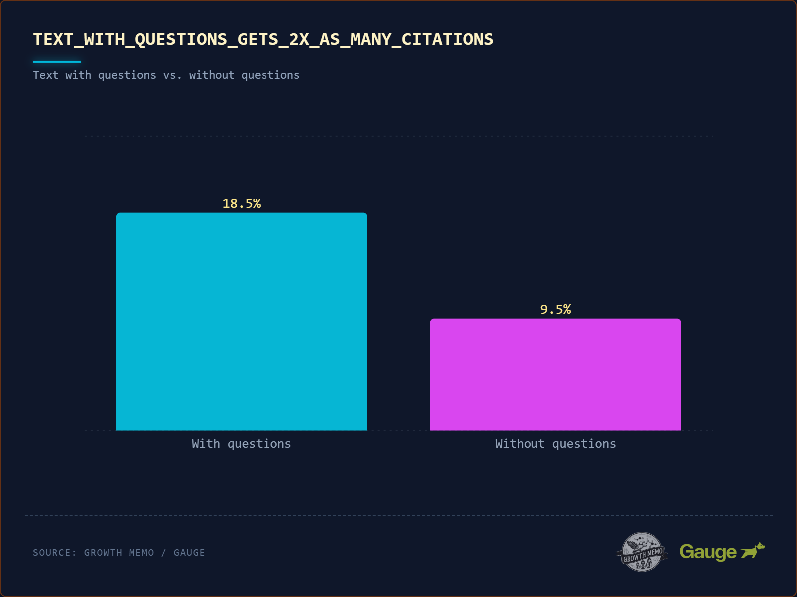 Text that gets cited is 2x more likely (18% vs. 8.9%) to contain a question mark. When we talk about conversational writing, we mean the interplay between questions and answers.