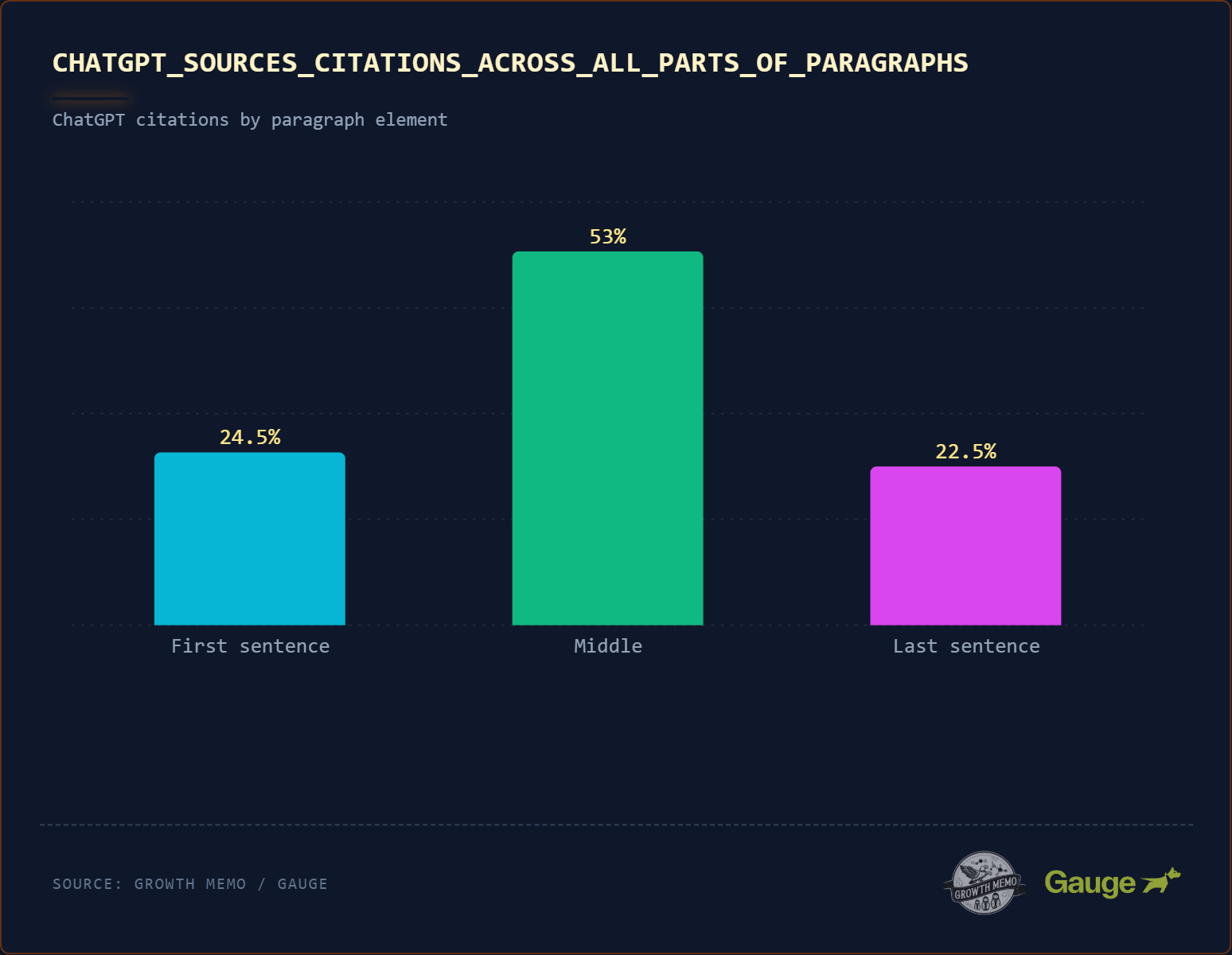 A deep analysis of 1,000 pieces of content with a high amount of citations shows 53% of citations come from the middle of a paragraph. Only 24.5% come from the first and 22.5% from the last sentence of a paragraph. ChatGPT is not “lazy” and only reads the first sentence of every paragraph. It reads deeply.