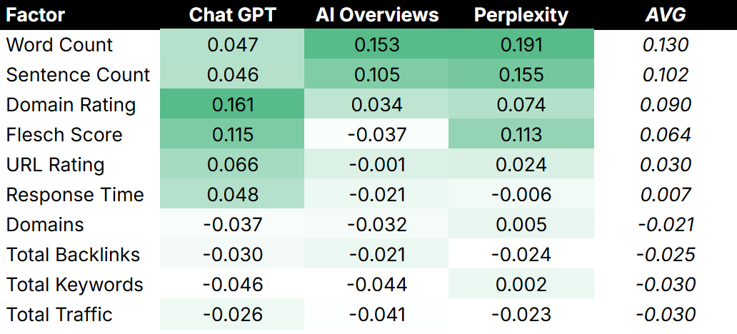 My correlation analysis shows that none of the classic SEO metrics have strong relationships with citations. LLMs have light preferences: Perplexity and in AIOs weigh word and sentence count higher. Chat GPT weighs domain rating and Flesch Score.
