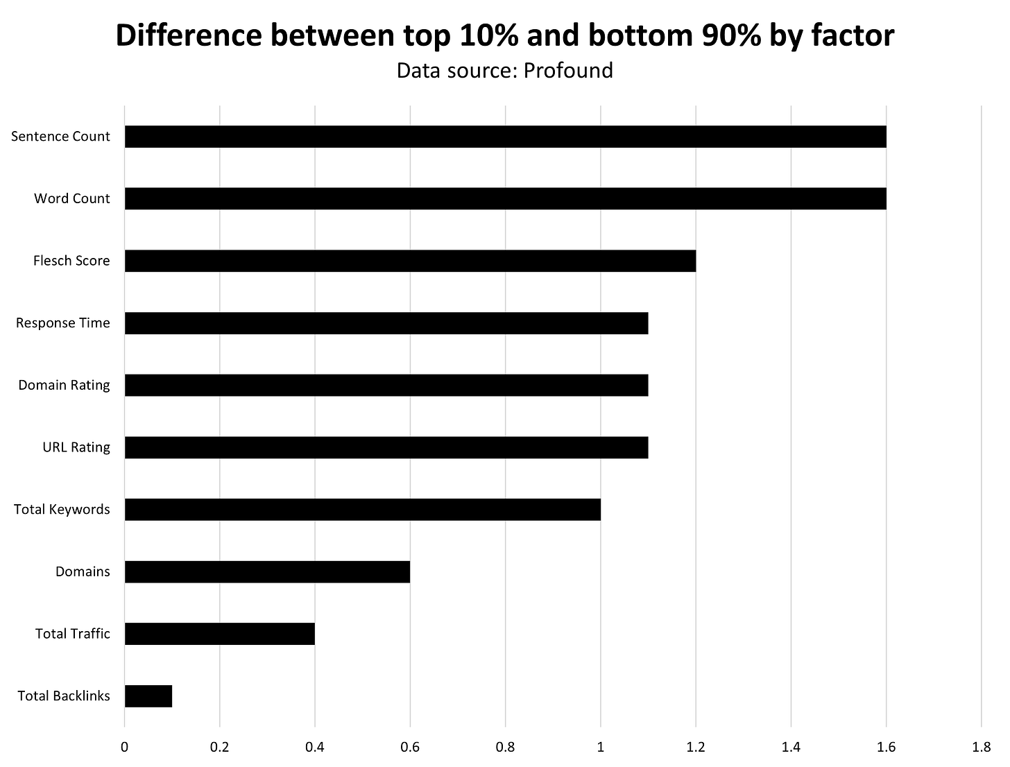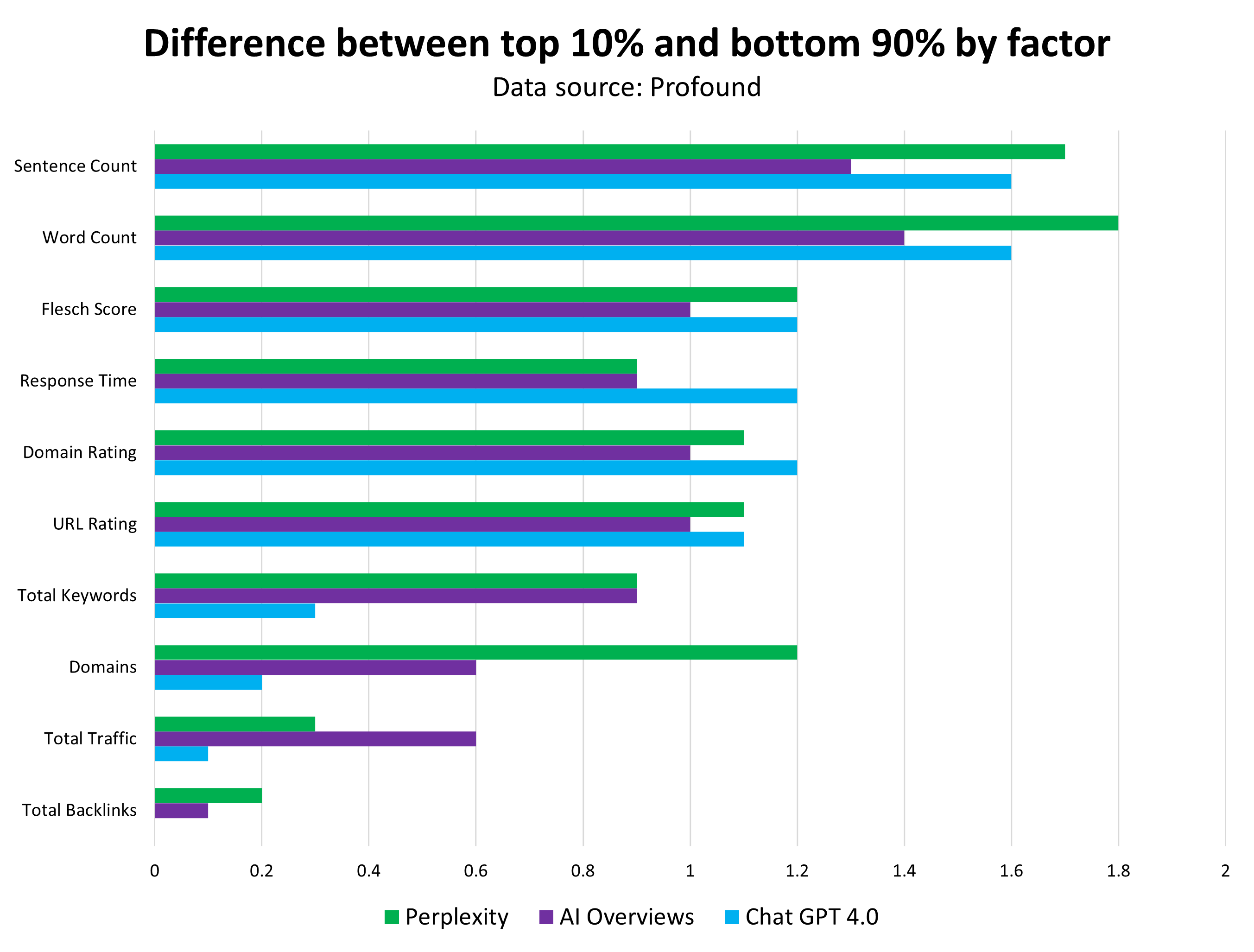 The two factors that stand out are sentence and word count, followed by Flesch Score. Metrics related to backlinks and traffic seem to have a negative effect, which doesn’t mean that AI Chatbots weight them negatively but simply that they don’t matter for mentions or citations.