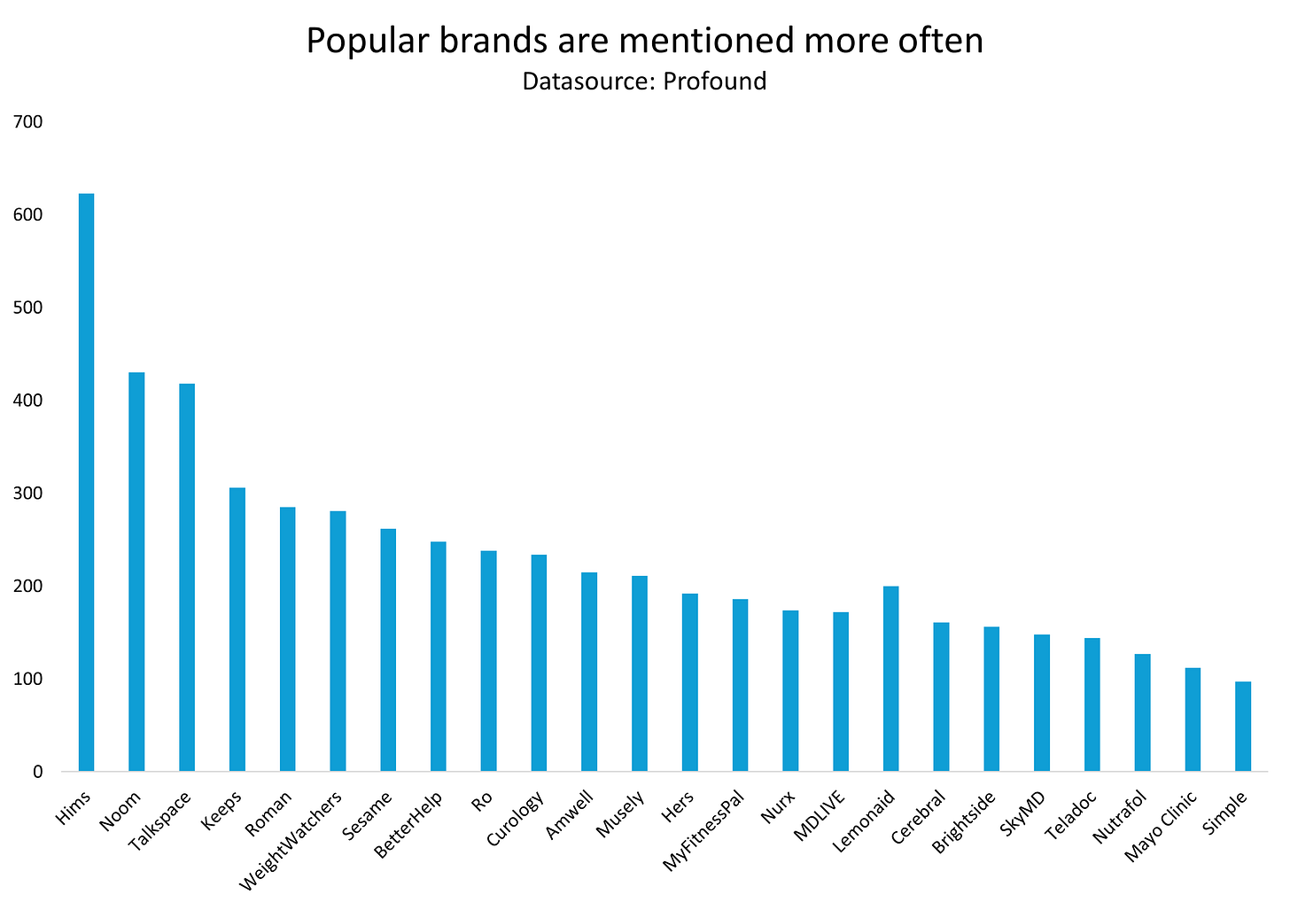 There is a clear link between the categories of the users' questions (mental health, skincare, weight loss, hair loss, erectile dysfunction) and brands.