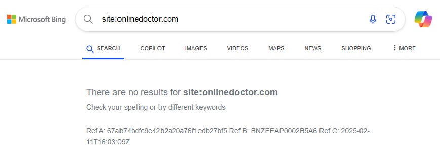 For example, Copilot doesn’t cite onlinedoctor.com because it’s not indexed in Bing. I couldn’t find indicators that this was done on purpose, so I assume it’s an accident that could quickly be fixed and rewarded with referral traffic.
