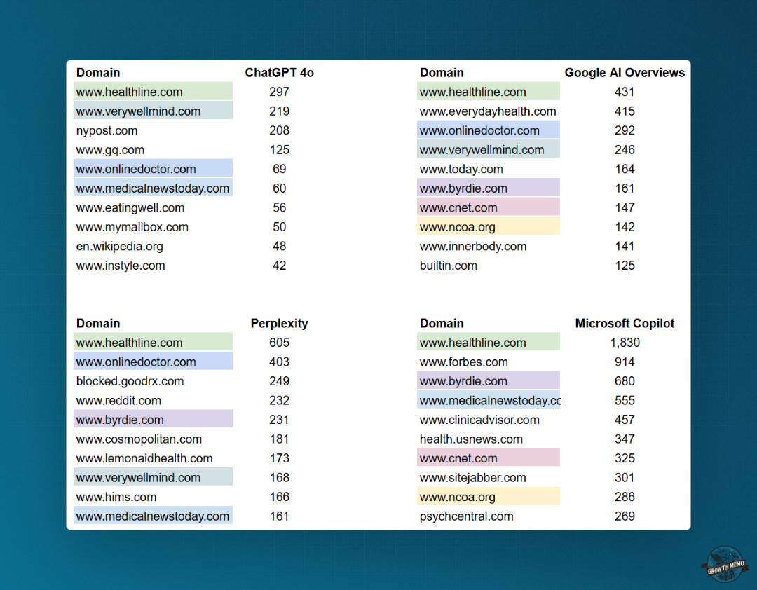 Examples: All models in my analysis cite Healthline most often. Not a single other domain was in the top 10 citations for all 4 models, showing their distinctly different taste and how important it is to keep track of many models as opposed to only Chat GPT - if those models also send you traffic.
