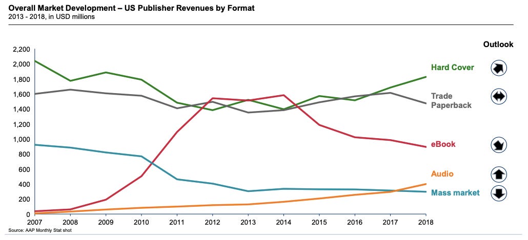 The reason is that publishers got into pricing battles with Amazon and Apple, which also started to play an important role in the ebook market (long story you can read here). Amazon attempted to cannibalize its core business (books) with the Kindle (ebooks) but couldn't make product pricing work, which resulted in ebooks often being more expensive than print editions. The technology changed, but consumers weren't incentivized to use it.
